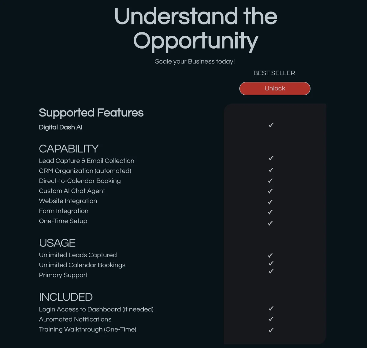 The Digital Dash AI Growth System works 24/7 on your website and social media. It engages prospects whenever they click to connect, even after hours, so you can capture more opportunities without being tied to your phone or computer.